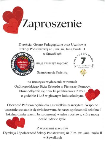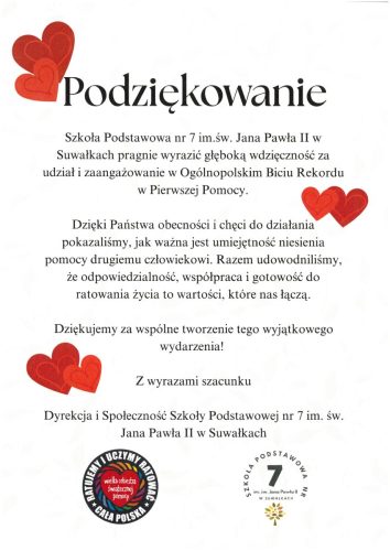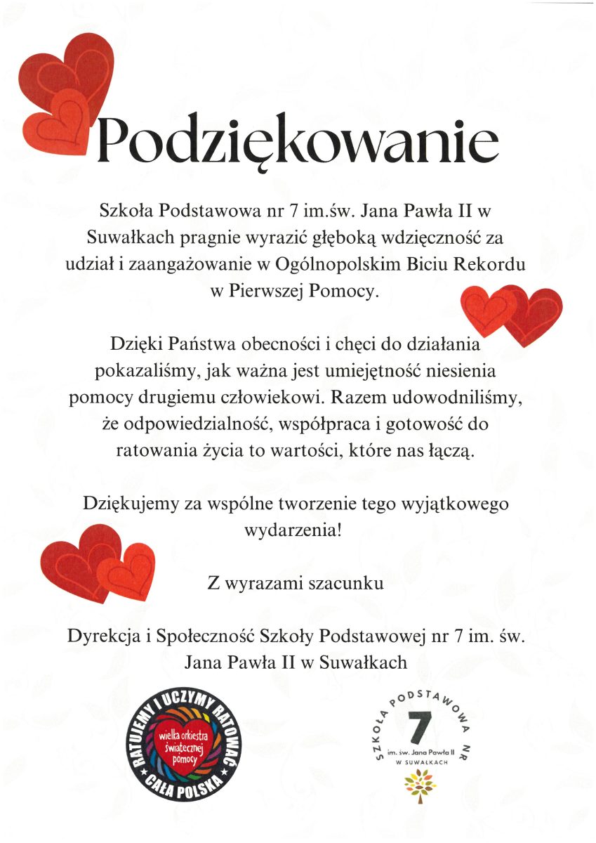 wspólnie z uczniami Szkoły Podstawowej nr 7 im. św. Jana Pawła II w Suwałkach wzięli udział w ogólnopolskim wydarzeniu Bicia Rekordu w Udzielaniu Pierwszej Pomocy organizowanym przez Wielką Orkiestrę Świątecznej Pomocy.