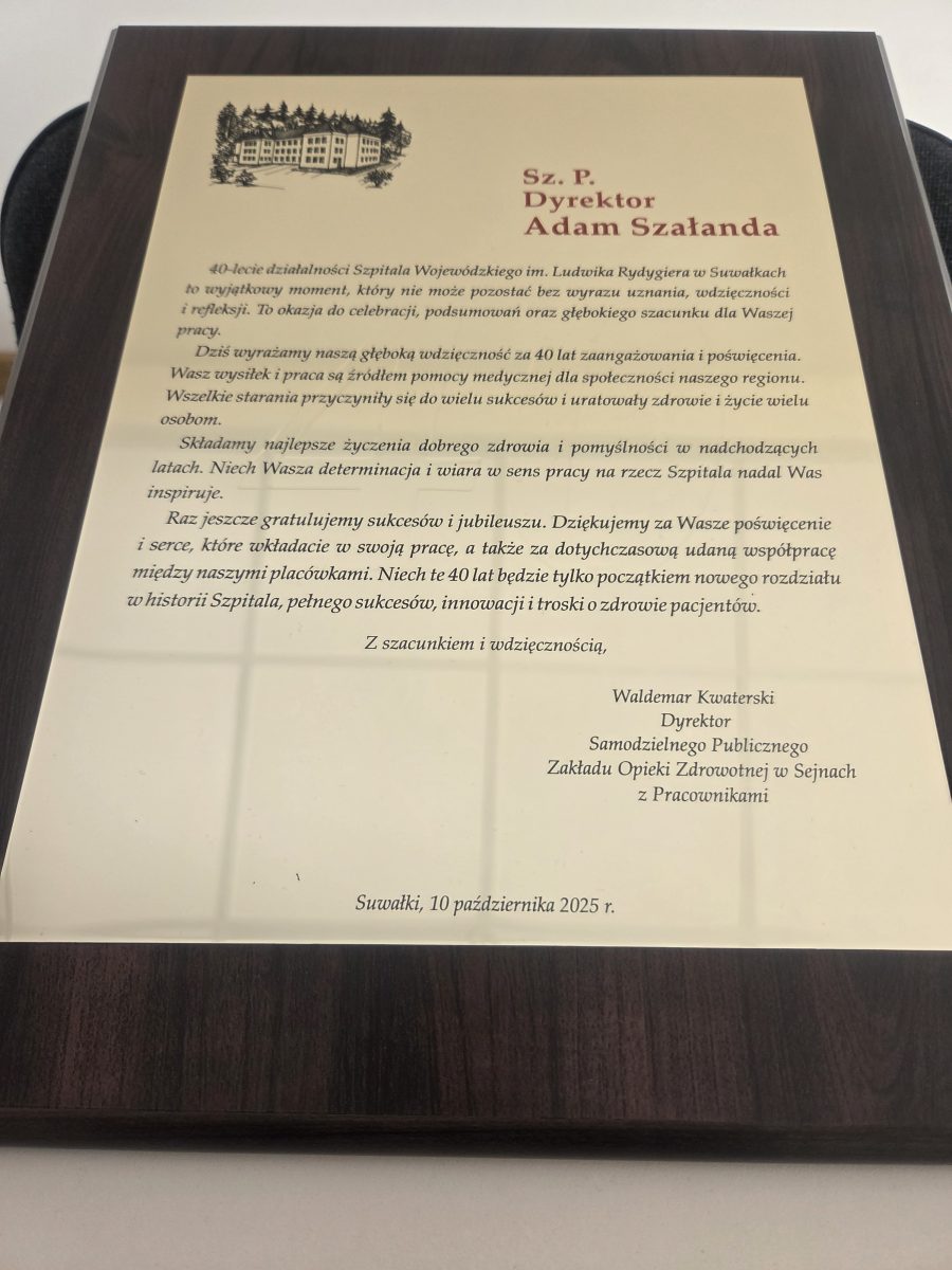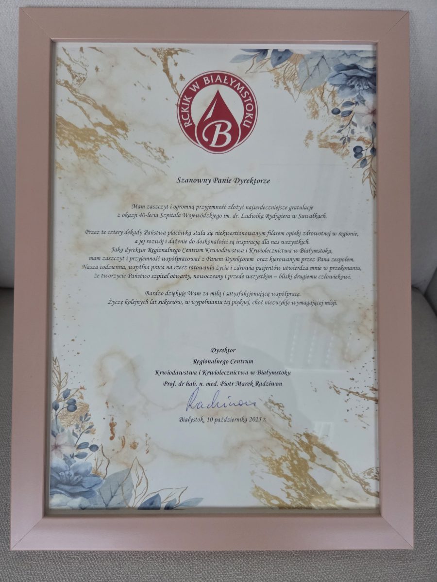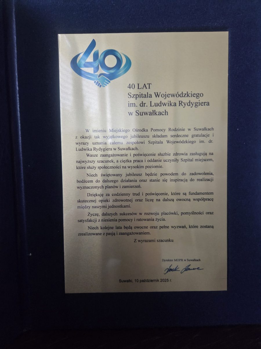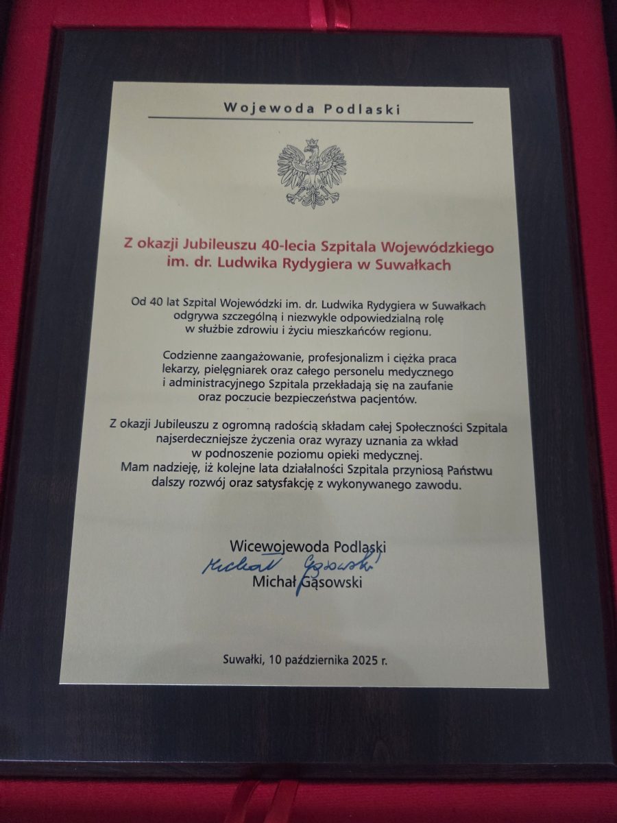 Szanowni Państwo, serdecznie dziękujemy za wszystkie życzenia, ciepłe słowa i obecność z okazji jubileuszu 40-lecia naszego Szpitala. Doceniamy pamięć, gratulacje, kwiaty oraz życzliwość, a Państwa wsparcie, szacunek i uznanie są dla nas niezwykle ważne i motywują nas do dalszej codziennej pracy. Cieszymy się, że nasza praca jest dostrzegana i doceniana przez społeczność, co sprawia nam ogromną satysfakcję.