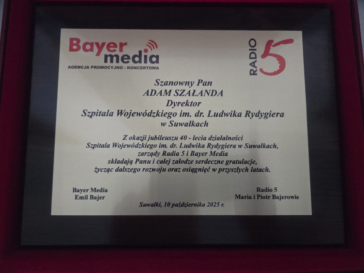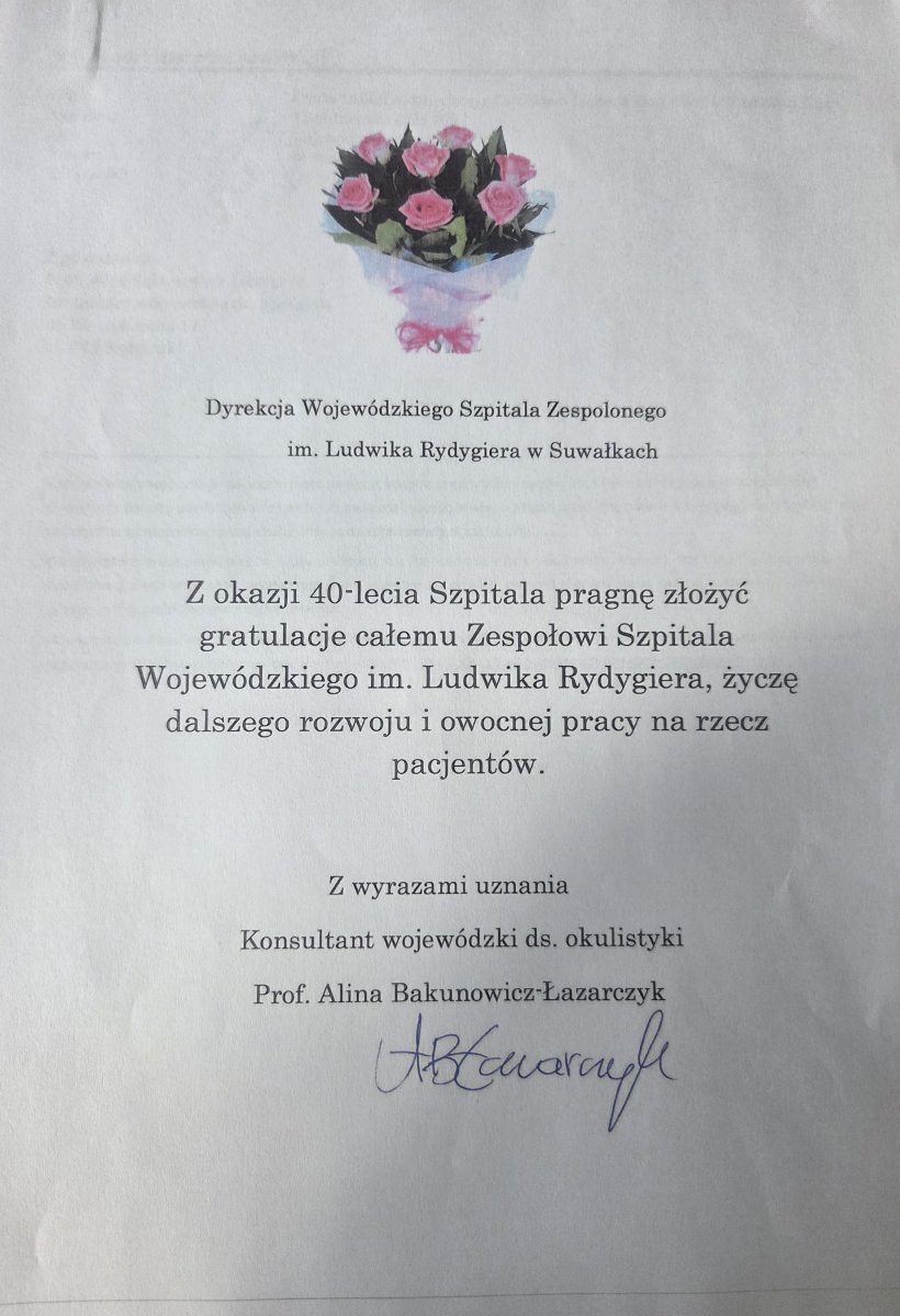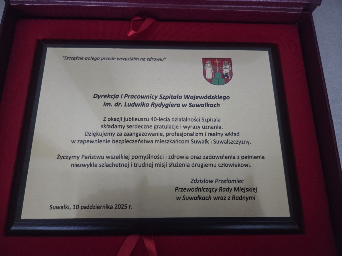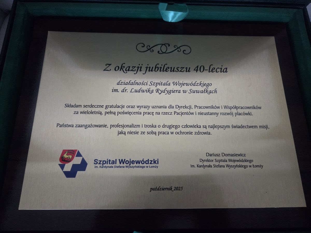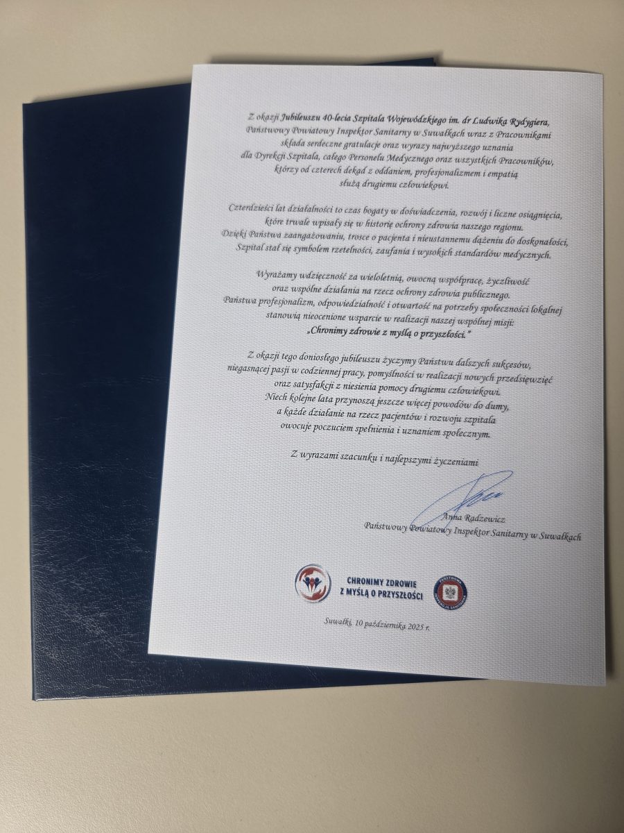 Szanowni Państwo, serdecznie dziękujemy za wszystkie życzenia, ciepłe słowa i obecność z okazji jubileuszu 40-lecia naszego Szpitala. Doceniamy pamięć, gratulacje, kwiaty oraz życzliwość, a Państwa wsparcie, szacunek i uznanie są dla nas niezwykle ważne i motywują nas do dalszej codziennej pracy. Cieszymy się, że nasza praca jest dostrzegana i doceniana przez społeczność, co sprawia nam ogromną satysfakcję.