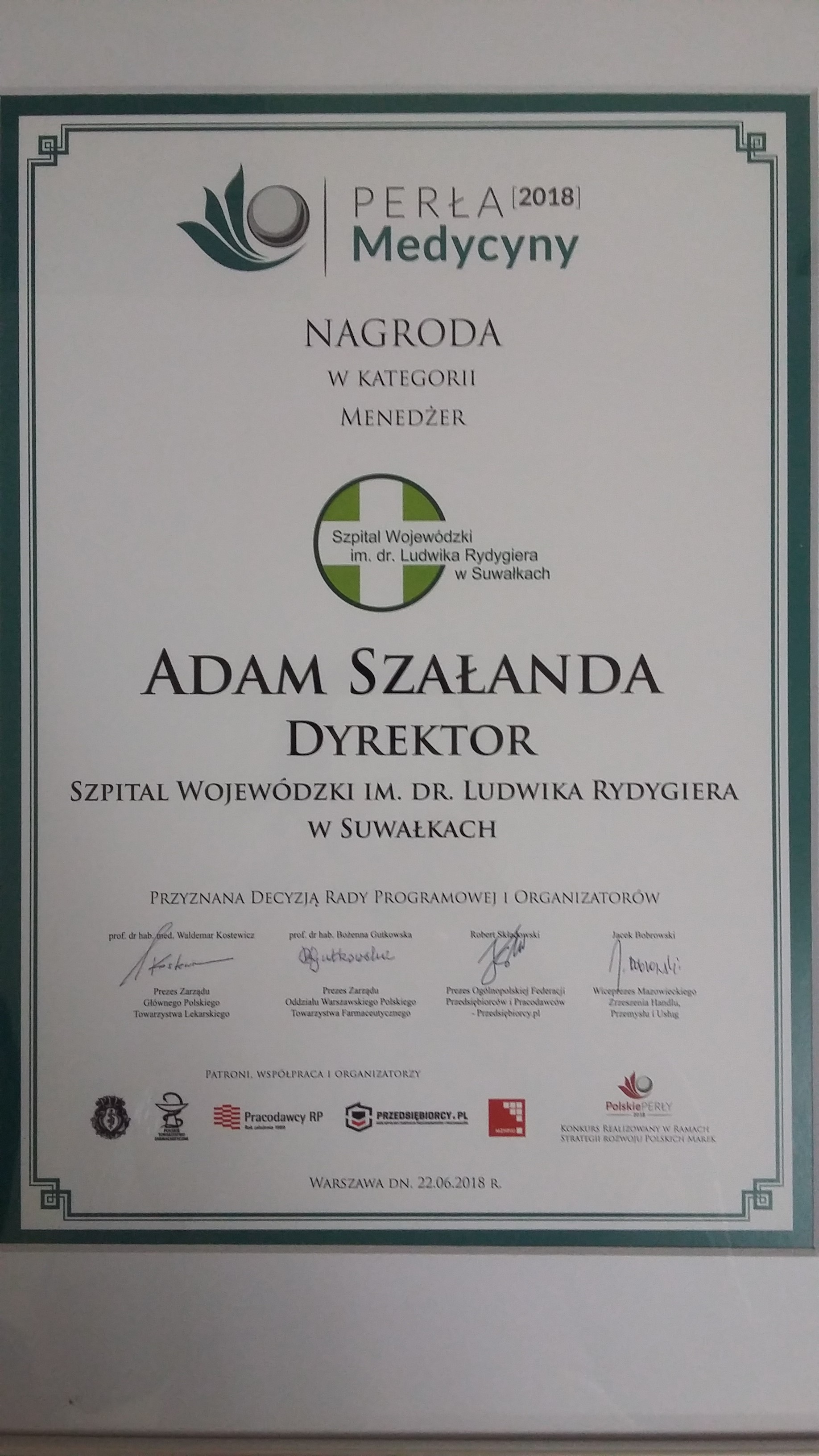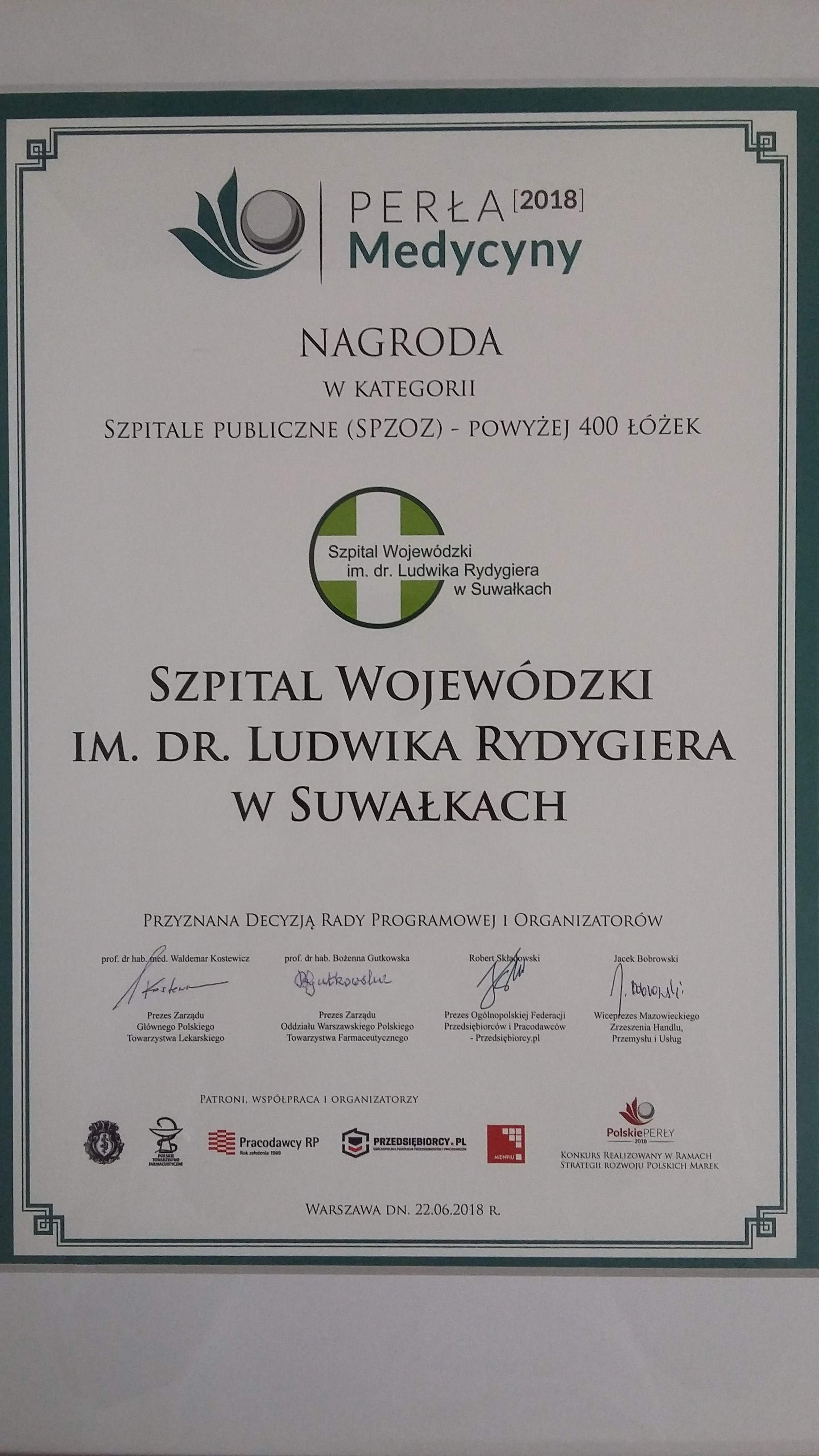 Szpital Wojewódzki im. dr. Ludwika Rydygiera w Suwałkach został doceniony i nagrodzony Perłami Medycyny 2018r. Organizatorem „Polskie Perły 2018” była Ogólnopolska Federacja Przedsiębiorców i Pracodawców.